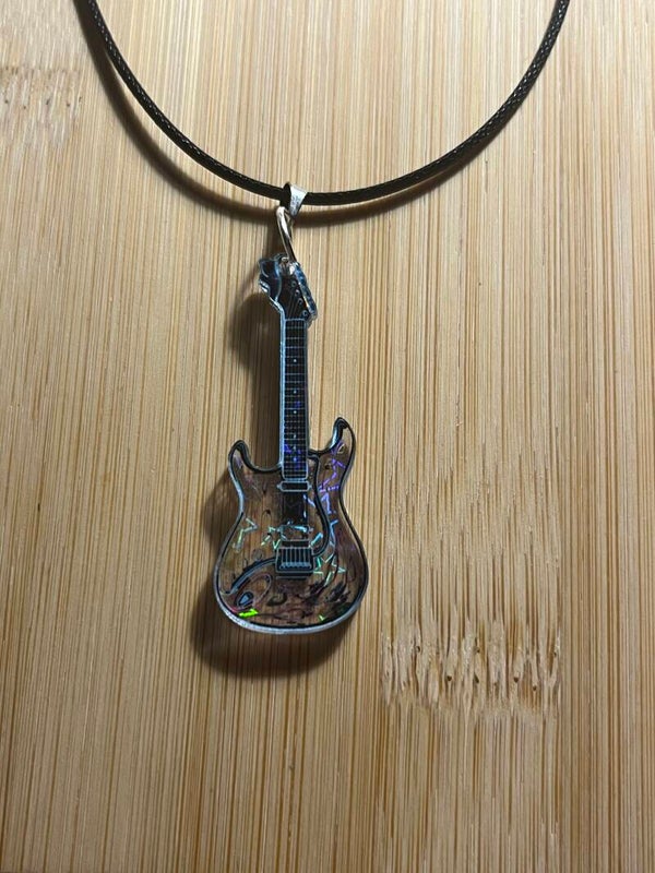 Lace style necklace with metal fastening featuring a acrylic guitar.